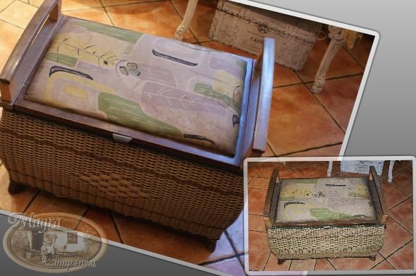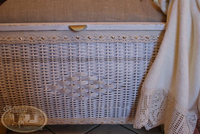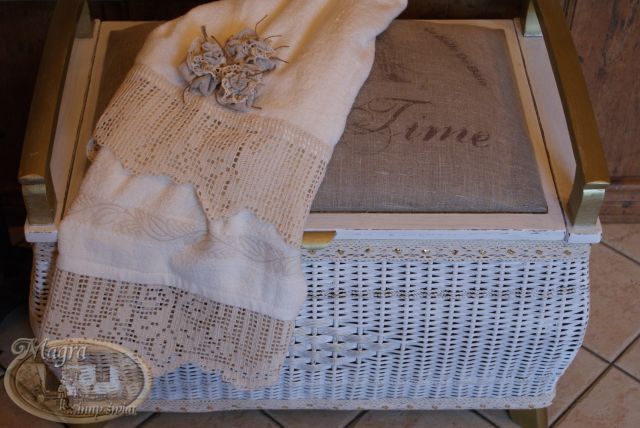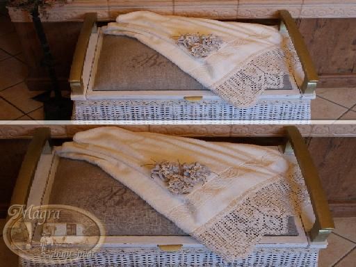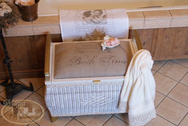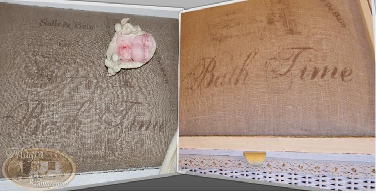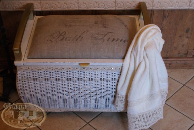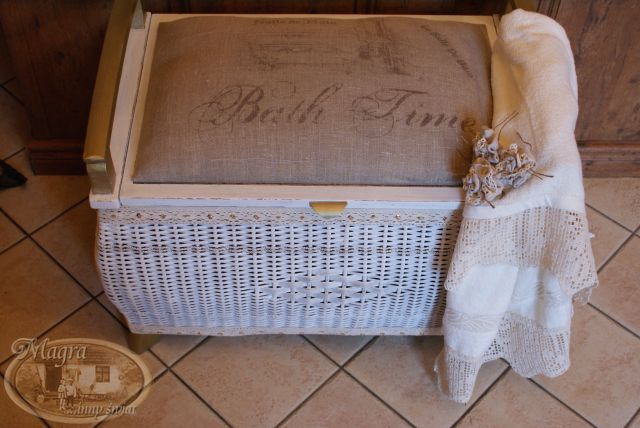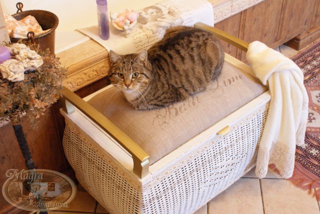 Mebelek przemalowałam, zmieniłam gąbkę i chciałam obić szarym płótnem. Kiedy robiłam przymiarkę materiału, Szarusia poprosiła czy mogłabym napisać, że to mebelek łazienkowy, należący do łazienkowego kota.