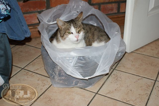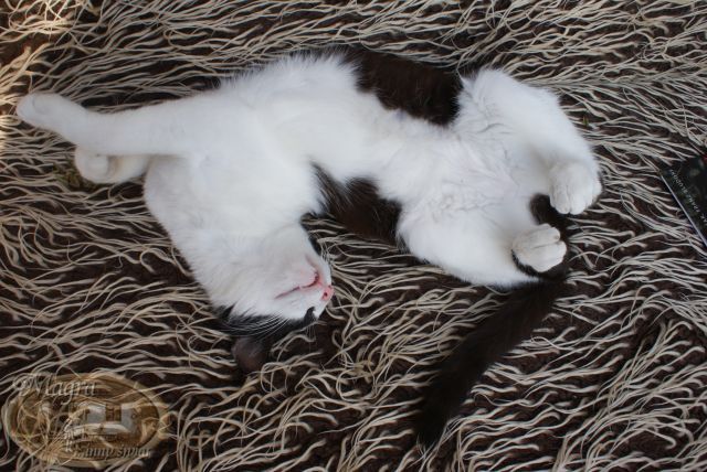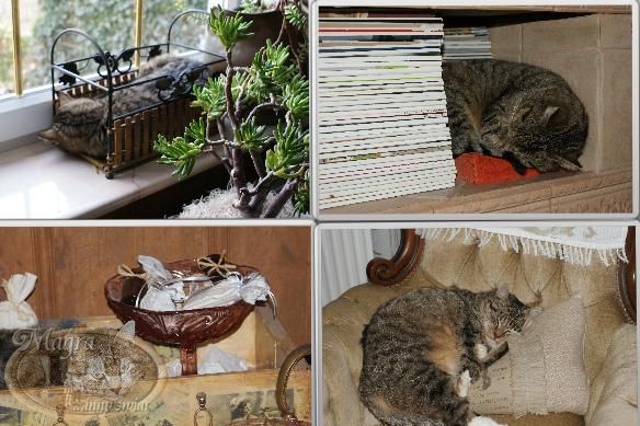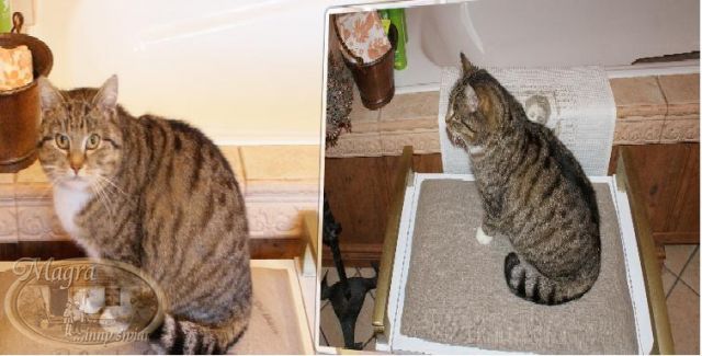 Nie wiem czemu, ale Szarusię biją inne nasze koty. Kiedy przychodzi do domu ukrywa się od razu w łazience i prawie z niej nie wychodzi. Śpi w różnych miejscach, no ale to nie to co mieć swoje własne łóżeczko.